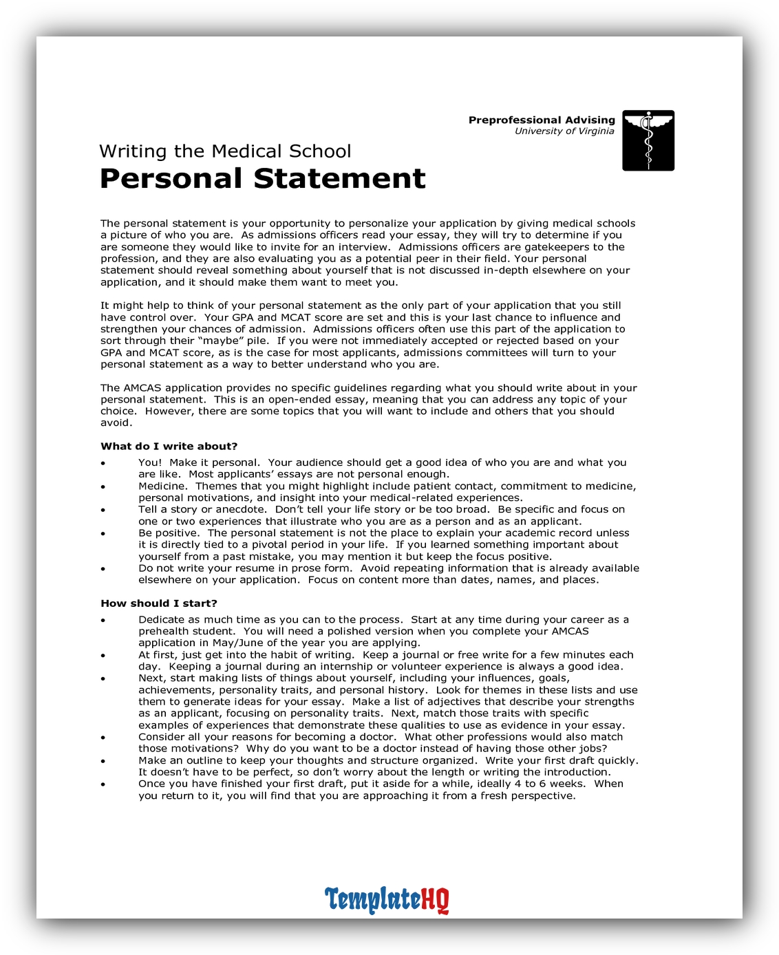 A personal statement is a document that provides information about yourself in relation to the professional schools you are applying to. The personal statement can be an essay, or it can be a short paragraph on your reference page of your application. Personal statements are required if you are applying to a graduate school, medical school or law school.