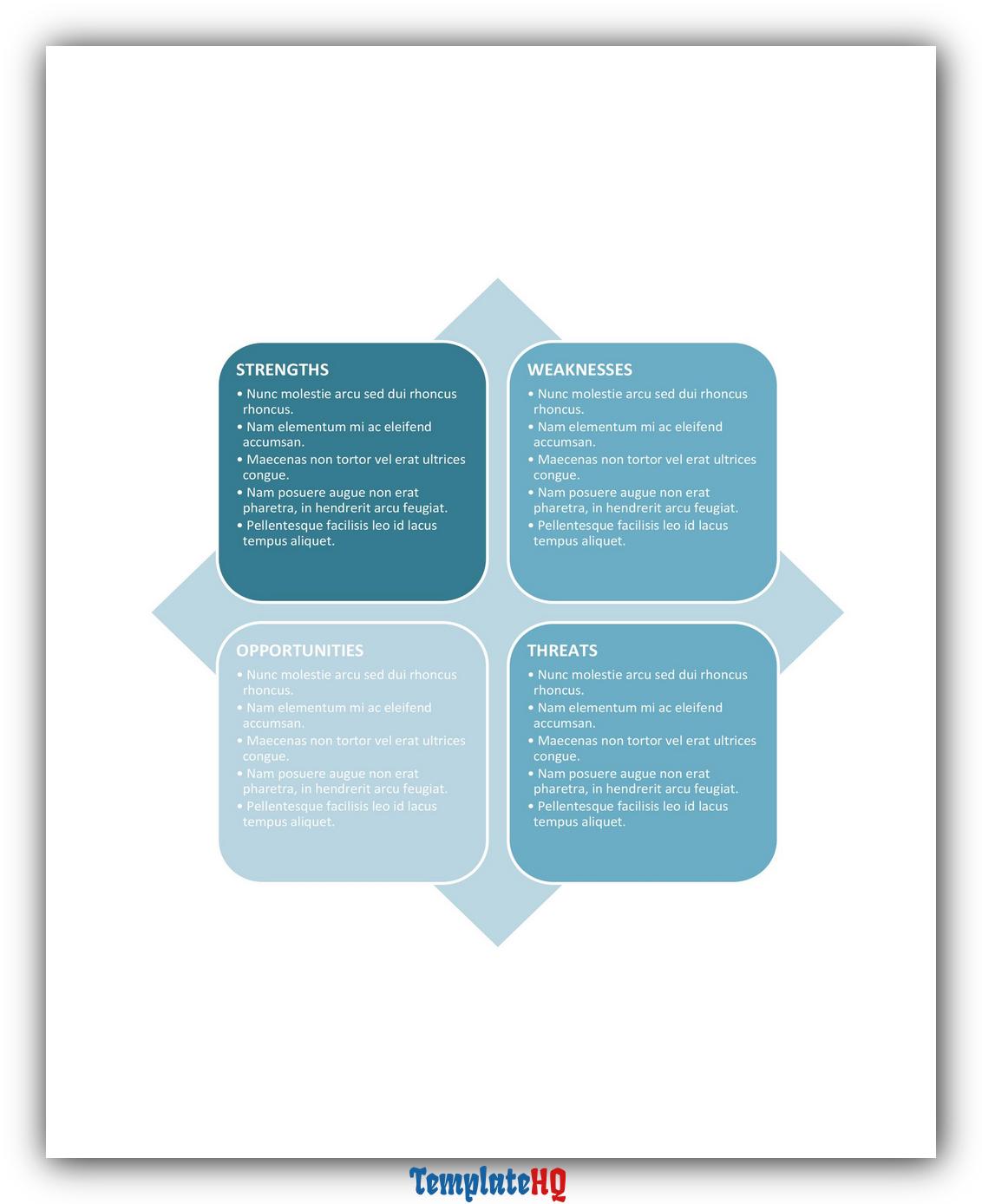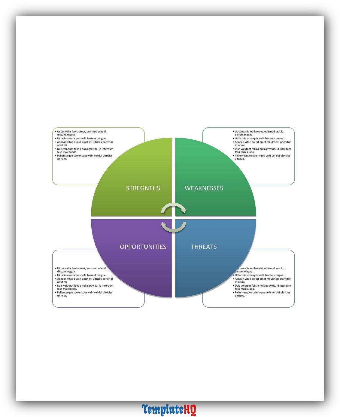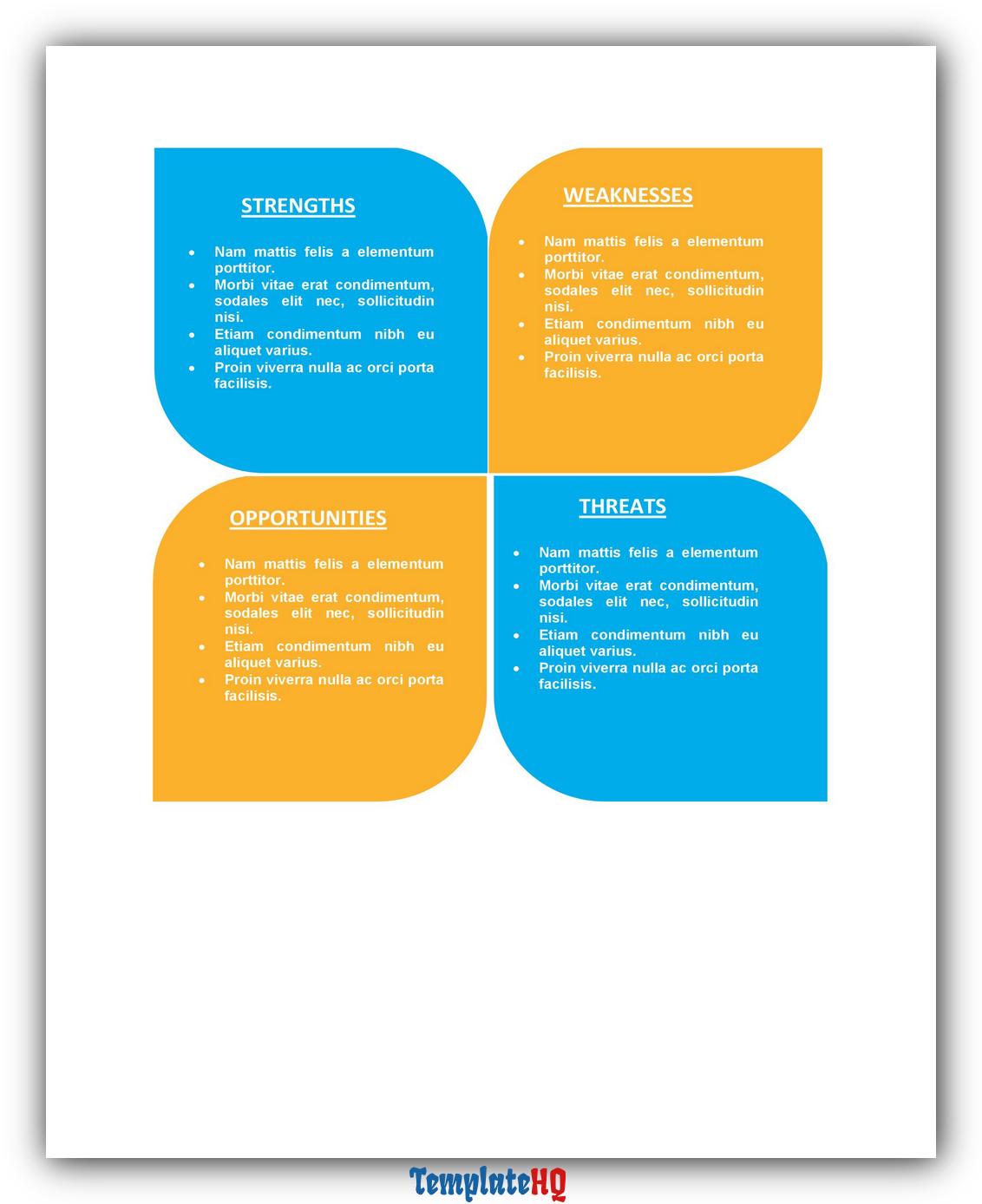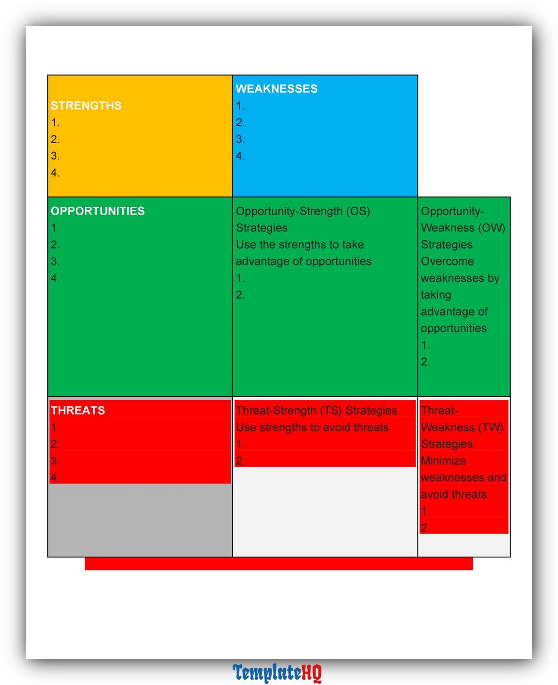 The if you want to make it bigger for presentation, change the paper size to A3 or A2. This editable SWOT analysis template excel can resize to the desired size. So the printing quality will always good.